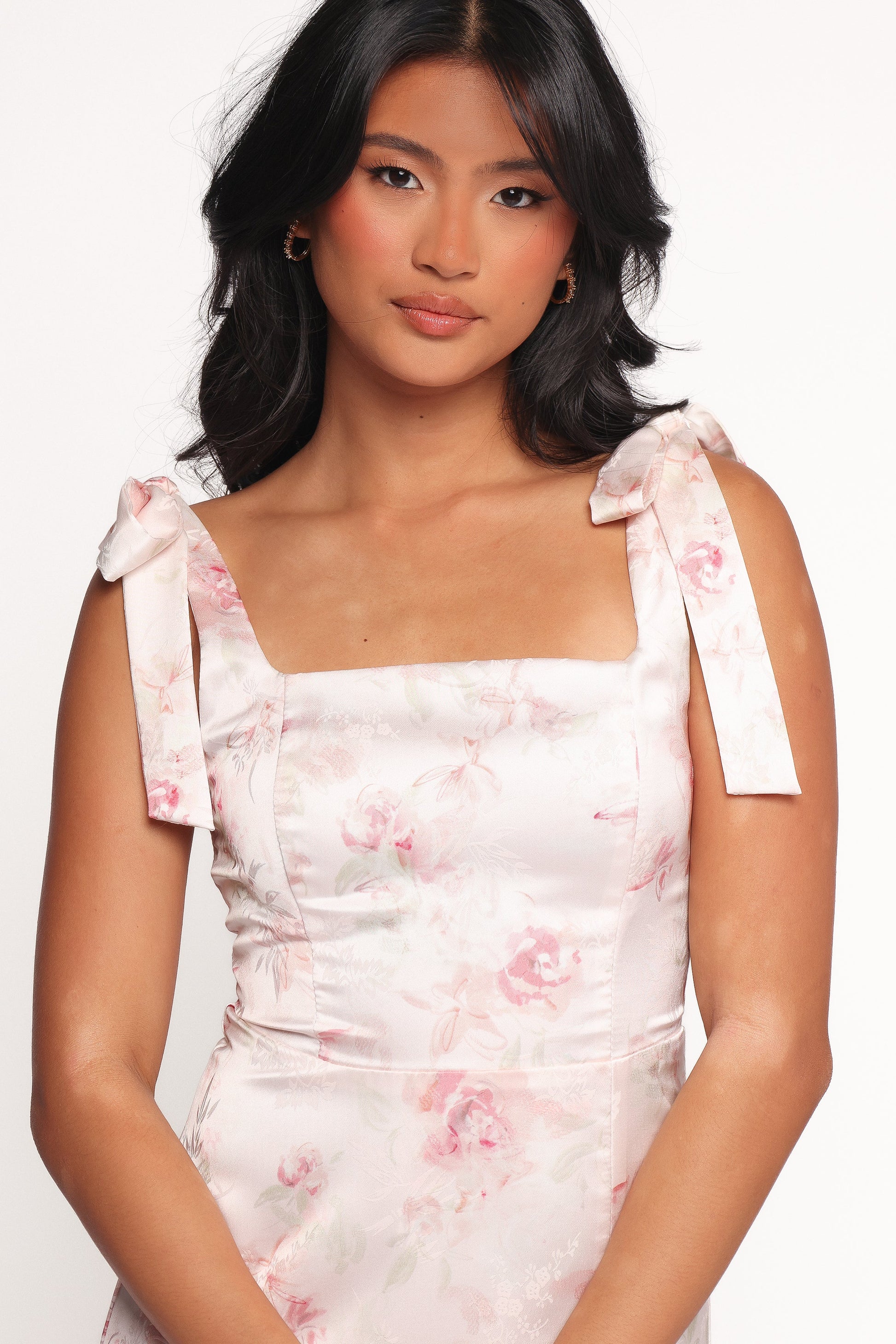DETAILS The Zane Midi Dress in Pink Floral is your go-to piece for a charming and effortless look. Featuring a flattering square neckline and delicate bow-detailed straps, this dress is all about subtle elegance with a modern edge.
