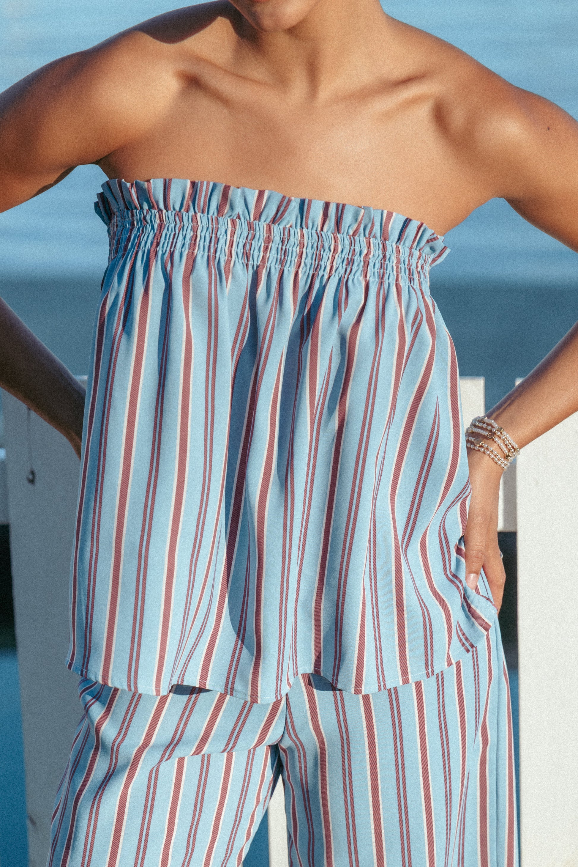 DETAILS Effortless and versatile, the Zemira Strapless Top in Blue Stripe is your go-to piece for laid-back yet elevated style. Designed with an elasticized shirred neckline, it effortlessly stays in place while providing all-day comfort.